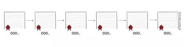 每个人都会在自己的页面上记录公告,直到该页面填满为止。页面填满之时,每个人必须通过解决一个数学难题来将页面内容封存。如此可以确保每个人的页面具有相同内容,且这些内容永远无法修改。第一个解决这一数学难题的人会得到一些加密货币的奖励。页面一经封存,就会添加至文件夹中,然后出现新页面,这一过程永远循环往复。