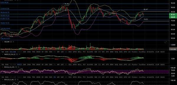 上轨短期压力位在85.5刀,突破有受阻迹象,后面久久不突破的话建议之前70附近接的先止盈避险。突破往上就是87、94刀的短期压力位,破位创新高依旧是之前说的110以上在考虑止盈问题。回踩的话,黄金618在75附近,之前给的70是最佳位置,64以下可以考虑抄底进入。