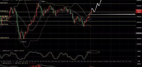 目前行情运行到19100附近一线,行情各周期MACD都有继续金叉迹象,虽然KD在80上方但目前依然有钝化迹象行情继续攀升概率较大,今日思路由于行情18000-19000的涨幅空,主要方式以现货操作为主.