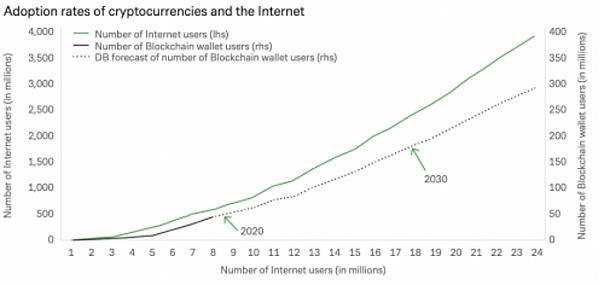 下图的绿线代表互联网人口,灰线代表2021年7000万的比特币规模,虚线是德意志银行的预测,可以看出发展速度非常快,这还不是CBDC的钱包,只是比特币的钱包。