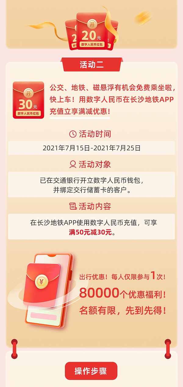 一方面,用户如果是通过活动入口首次开通的数字人民币钱包,并选择交通银行开立,即可活动20元活动红包;另一方面,用户可以通过数字人民币钱包对“长沙地铁App”进行充值,享受“满50减30元”的优惠,仅限于开通了交行数字人民币钱包并绑定交互储蓄卡的用户。