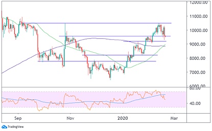 比特币在2月13日创造了$10510(OKEX BTC指数价格)的近期最高点,随后开启下跌走势。经过三轮下跌,并在向下测试前期支撑位$9550附近后止跌,最终并未直接打穿该区域,短线开始反弹。在本周末有很多交易者心跌破币价直接$9550,使得出现中期的趋势反转,不过该支撑位最终守住。而在随后币价反弹突破$9800后,交易量放大,并在周二晚间再次测试前期密集成交区$10200至$10300,许多交易者希望看到币价能够回补CME期货在周末留下的缺口,该缺口上方至$10,460。但在2月20日凌晨,比特币的放量下跌使得希望落空。