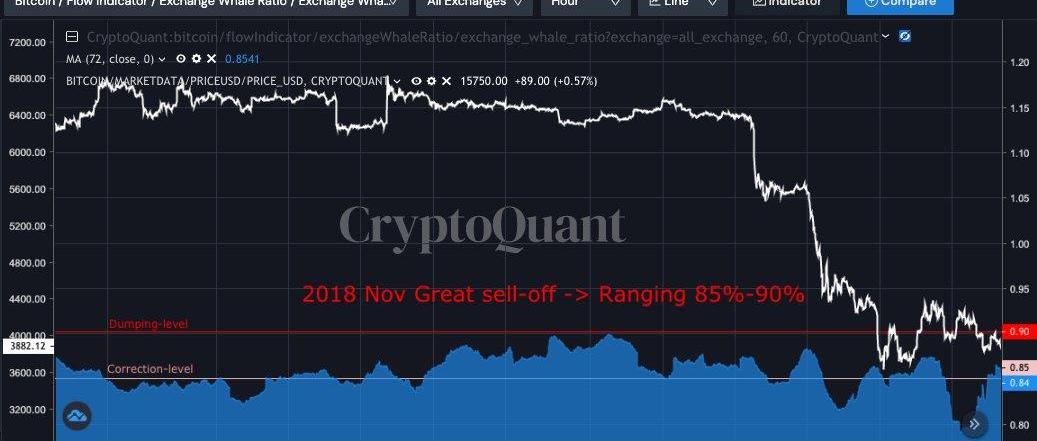 再看2018年比特币在6000美元横盘的末期,交易所巨鲸比率数值持续处于85-90%,后来破位下跌到了3200美元,进入寒冬。