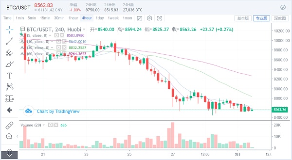行情数据显示,本周BTC持续下行,当前报价8563美元,本周最高为9980美元,最低达到8448美元。
