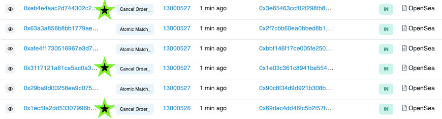 一些以太坊钱包似乎在NFT市场上以惊人的速度取消了订单。截止撰稿时,使用OpenSea合约的最后1000笔交易中,有超过四分之一被取消。大多数其他交易涉及匹配NFT买家和卖家。