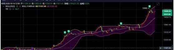 从4小时图来看,目前布林带上轨已有回头迹象,币价也回踩往中轨方向运行,今天还会是一个横盘调整的过程,振幅不会很大。