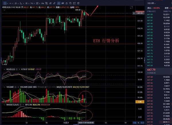 小时图分析,以太昨天白盘是震荡上行,重心不断上移。晚间6点后K线在高位横盘震荡。目前K线在447附近运行。技术上布林带开口向上,K线沿着上轨通道慢慢向上运行。各均线托着K线继续向上发散。幅图KDJ三线向上开口。MACD快慢线在0轴线上方运行,空头量能柱慢慢缩短。VOLUME成交量加大。综合各个技术指标看,短期回踩顺势看多。