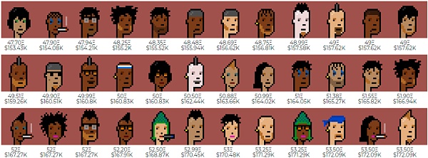 CryptoPunks (加密朋克) 是今年 NFT 热潮的最大受益者之一,该系列的 NFT 像素头像价值大幅上涨。上周,CryptoPunks 的市场最低价首次突破了价值 100,000 美元 (39 ETH),且根据其背后团队 Larva Labs 的官方追踪器,截至撰文时,当前 CryptoPunks 最低售价为 47.7 ETH (约合 15.34 万美元)。见下图: