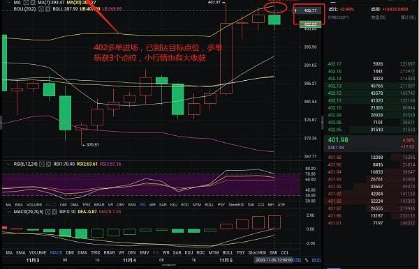?400-402附近多单进场,目标点位405-410附近,破位继续持有,已到达目标点位405,多单斩获3个点位,行情来了,你挡都挡不住。这波你跟上了吗,实力等你来验证。
