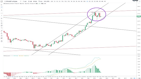 昨日再次向上试探关键周线阻力趋势线,被大盘大幅下砸给带下来,日线形态上有形成双顶的迹象,下方重要颈线支撑237美元,放量跌破双顶将确立,后续继续回落将是大概率,目前价格位于10日线附近波动,5日线开始拐头下行,中长期均线多头排列,多头趋势还在,结构上目前仍处于上升通道内,并未破位,目前不建议杀跌,趋势支撑243美元。