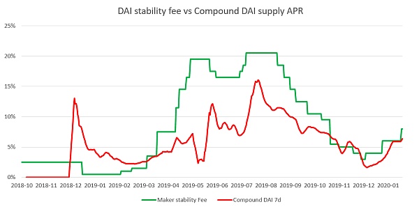 我们先看看第一个货币市场利率——Compound 的 DAI 供给年利率 (APR)——在 DAI 稳定费的背景下有怎样的表现: