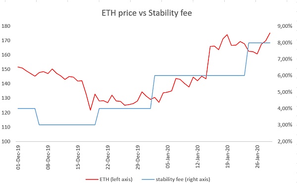 我们可以看到,自 2020 年开始,这一幕的确发生了——ETH 的价格从 120 美元涨到了 170 美元,稳定费也从 4% 涨到了 8%。以下是 2019 年 12 月初以来 ETH 价格与稳定费的图表: