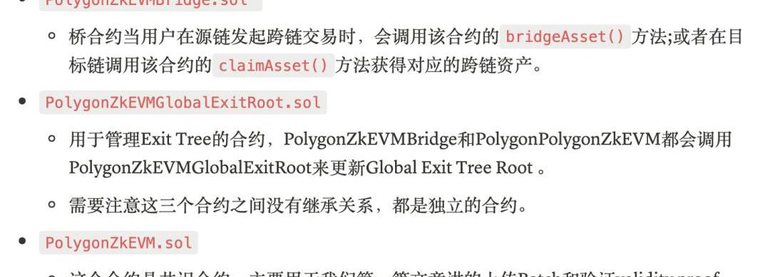 需要注意的是他们之间不是继承关系,都是独立的合约,PolygonZkEVMBridge和PolygonZkEVM都会调用PolygonZkEVMGlobalExitRoot来更新或验证GlobalExitTreeRoot。