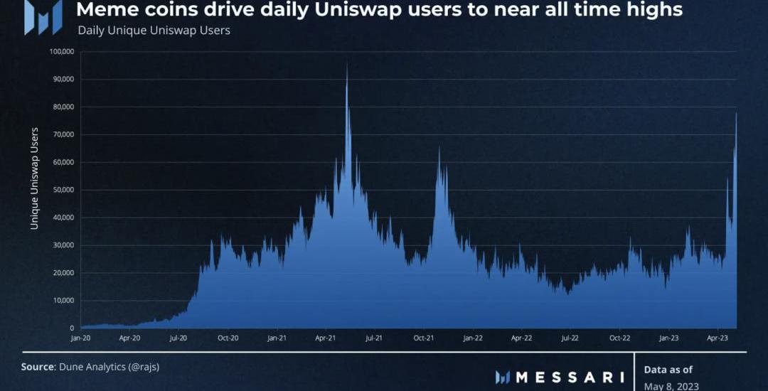 另一个值得关注的数据点是以太坊上?Uniswap?的每日活跃用户数。这个数字自?PEPE?发布以来已经翻了一倍多,现在快速接近?2021?年?5?月的每日?90,?000?用户的历史最高记录。Uniswap?移动钱包的集成自?2021?年以来已经有所改进,如果?PEPE?的关注度继续增加,可能会创下新的每日用户记录。