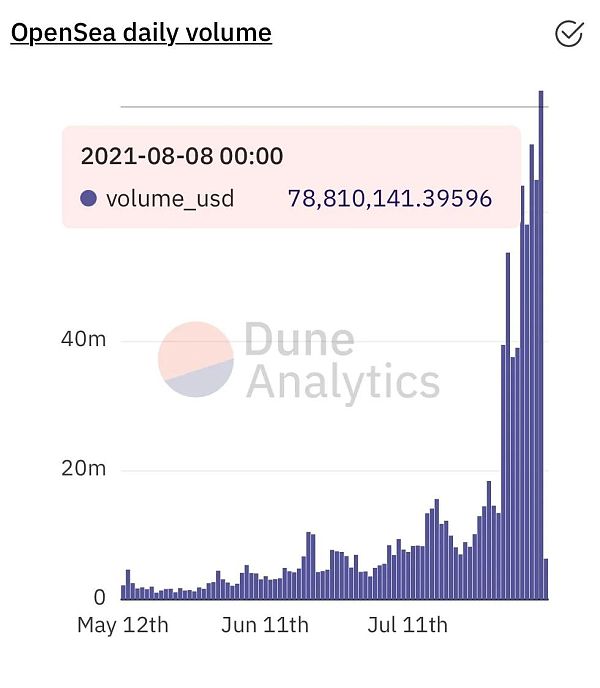 受BAYC巨大成功的影响,6月至今各类动物肖像类NFT项目层出不穷,NFT整体市场也呈现出爆发式的增长,这与近几个月加密货币市场整体低迷的表现背道而驰。据Dune analytics数据,自2021年5月以来,全球最大的加密数字藏品市场 OpenSea日交易额逐日增加,尤其是进入6月后日交易额屡屡突破新高,8月8日单日交易额超7881万美元,创历史新高。