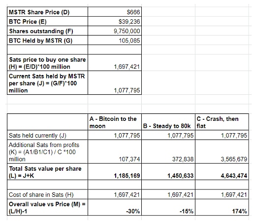 问题是:“如果我们将一个比特币投资于 MSTR 股票,当我们对这些股票进行比特币估值时,我们会获得正回报吗?”