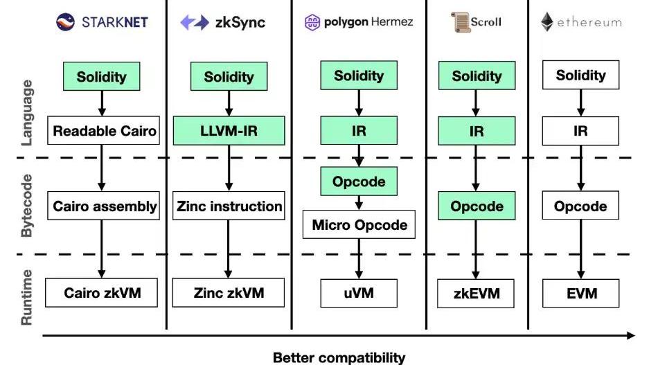 这种方法需要构建一种新语言——旨在支持有效性证明——并开发自定义操作码。开发人员需要直接用新语言编写合约,或者将?Solidity?源代码编译为自定义?zkEVM?操作码。?