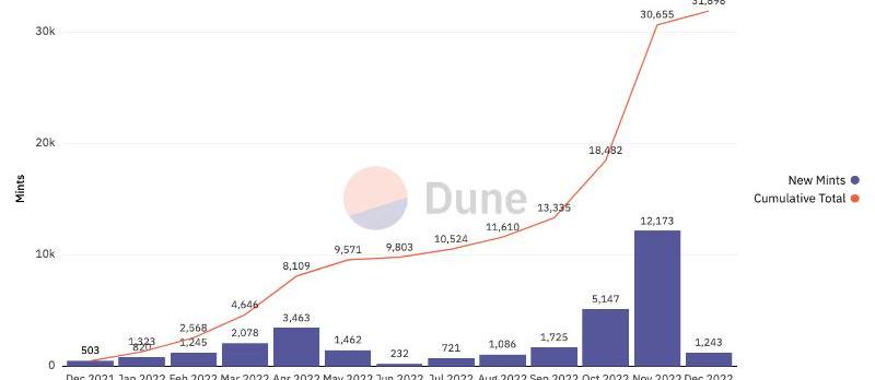该平台上铸造的歌曲数量早在10月就达到了历史高点,但随后在11月将这一指标提高了一倍多,单月铸造的音乐NFT超过12,?000首。作为参考,这比2022年4月的前一个记录增加了242%?,当时ETH超过3000美元。