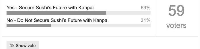 Kanpai的概念诞生于2021年6月的一项治理提案,其作用是从xSUSHI的0.05%收入中再抽取一部分,用于补充Sushi财库收入并丰富财库资产类别,以应对随时会到来的熊市。简单来说,Kanpai是一个参数,代表了财库和xSUSHI持有者的分配比例,当前该参数为10%?,意味着财库分配10%?,xSUSHI持有者分配90%?。