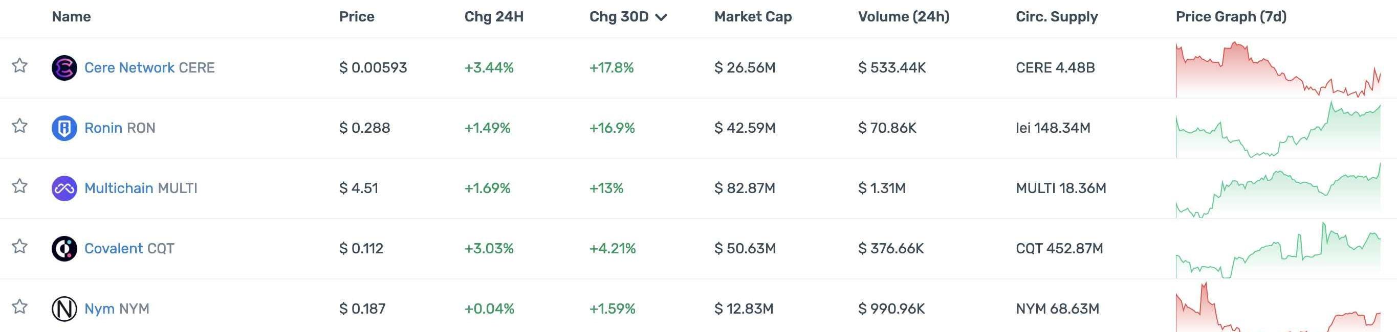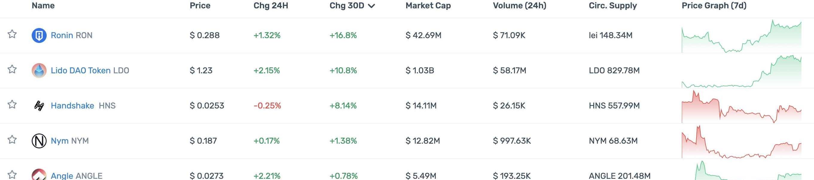 4、在过去一个月,很多此前被大肆炒作的去中心化社交项目的表现十分糟糕,目前该领域也没有一个具有统治力的项目,观察接下来Nostr以及Farcaster的发展会非常有意思。