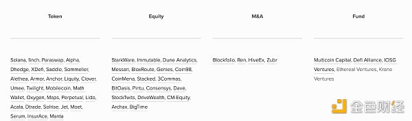 另外,在金色财经的梳理中发现,Alameda Research连同Multicoin Capital、Three Arrows Capital等投资机构多次共同出现。