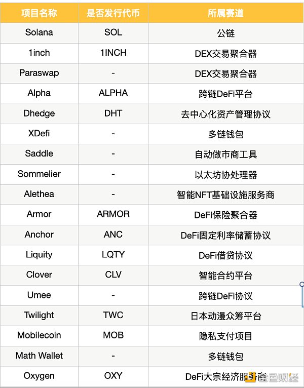 金色财经整理发现,在29个代币项目中,Solana生态有4个,DEX以及钱包类有8个,DeFi类12个,隐私类项目有2个,包括Mobilecoin、Manta值得关注。