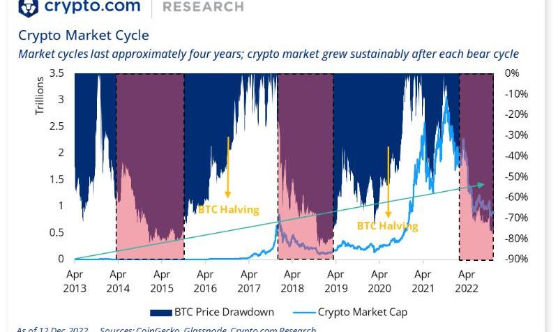 除了宏观逆风外,加密货币市场也受到了一些事件的负面影响,特别是?5月Terra稳定币的崩溃和11月FTX的破产。这两个事件和随后的影响产生了连锁反应,影响了生态系统中的其他参与者,并抑制了其对该行业的信心。在写这篇文章的时候,可以说这仍然是"加密货币的冬天"。话虽这么说,市场周期在熊市和牛市之间波动是自然的,如下图所示。