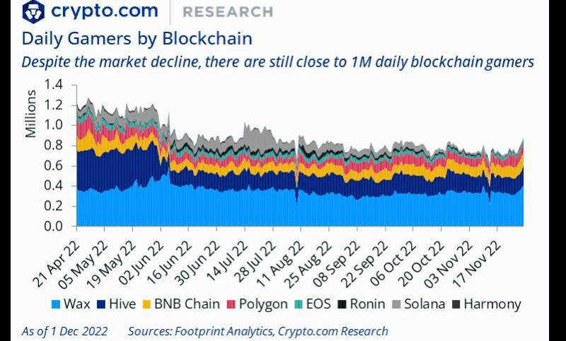 尽管市场低迷,但在2022年的大部分时间里,每天仍有大约100万区块链游戏玩家。Wax区块链目前在每日游戏玩家数量方面处于领先地位,截至撰写本文时为315,000人。Wax有不少顶级区块链游戏,例如Splinterlands和FarmersWorld。