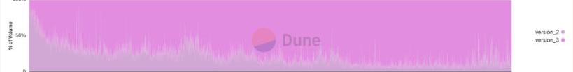 在2021年3月UniswapV3推出集中流动性AMM机制以后,资本效率相比之前有了数十倍的提升。从下图也可以看到,UniswapV3推出以后开始不断蚕食V2的份额,目前平均占比超过70%。