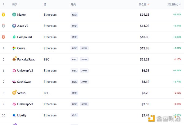 DeFi项目锁定资产前十排名及锁仓量,数据来源:Debank