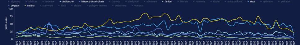 从体量来看,SOL和BSC长期霸占前两位,接下来是Near/Polygon/Avax,而Ftm垫底。
