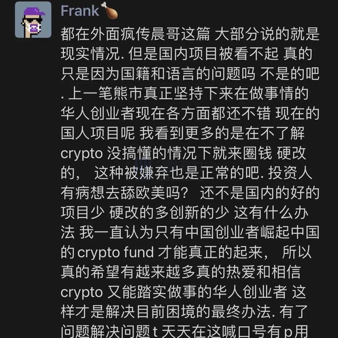 上一笔熊市真正坚持下来在做事情的华人创业者,现在各方面都还不错。现在的国人项目呢,我看到更多的是在不了解crypto,没搞懂的情况下就来圈钱、硬改的,这种被嫌弃也是正常的吧。