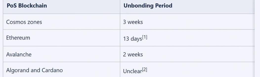表1:Cosmoszone、PoS以太坊、Avalanche、Algorand以及Cardano等不同PoS区块链的质押解锁期。