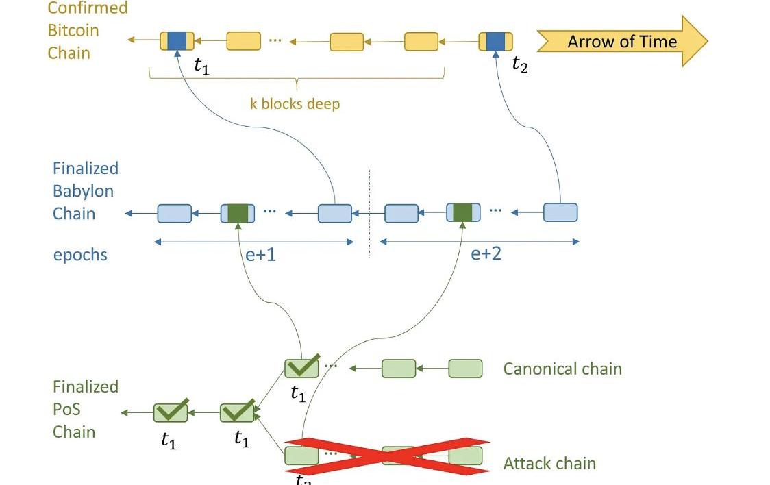 通过使PoS链能够使用比特币作为时间戳服务,Babylon将PoS链的质押解锁时间从几周缩短到几个小时。由于比特币区块内空间不足,无法直接在比特币上对PoS区块进行检查,Babylon作为单独的PoS链聚合PoS链所发送的检查点,并代表它们发布到比特币。Babylon架构通过其针对未绑定验证者的K深度提取规则防止长程攻击,并保证在发生短程安全攻击的情况下罚没攻击者的质押权益。