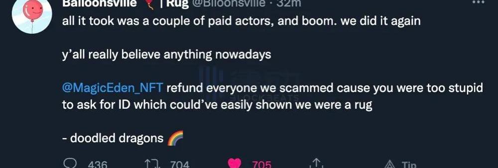 这是MagicEden上最初的一个Rug项目Balloonsville对其进行的嘲讽。Balloonsville系列中有5,000个NFT,通过MagicEden的Launchpad进行mint,成功赚取了超过17,890SOL,然后宣布这一切都是其精心策划的局。
