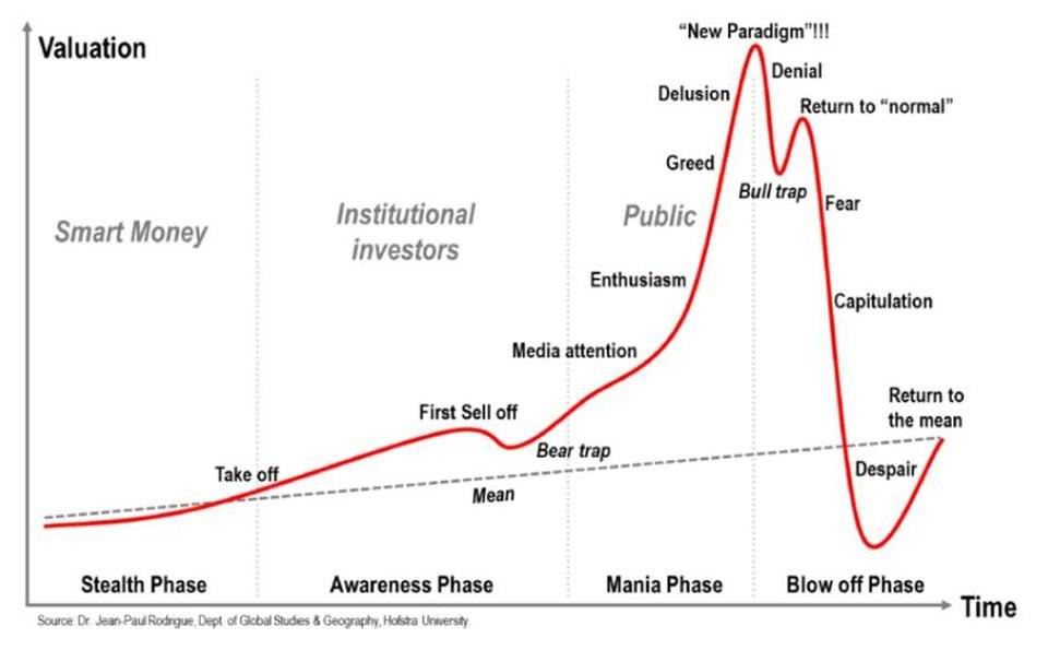 Jean-Paul Rodrigue 博士发表了一张广为流传的经济泡沫图表,其中他确定了泡沫的四个不同阶段,称为 (i) 隐形阶段 (ii) 意识阶段 (iii) 狂热阶段和 (iv) 破灭阶段。