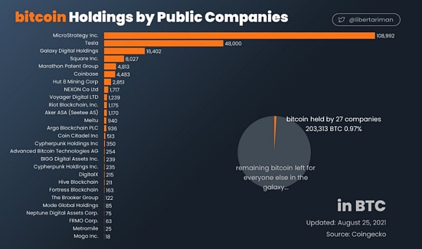 许多公司透露购买比特币是用来多元化资产配置、对抗通胀;而Microstrategy创始人迈克尔·塞勒(Michael Saylor)则像是拿比特币来豪公司以及个人的未来,甚至是利用公司的名义来借钱购买比特币。2021年6月8日,根据华尔街日报报道,MicroStrategy发售4亿美元垃圾债来购买更多的比特币。8月25日,MicroStrategy 再次以约 1.770 亿美元现金购买 3907 个比特币,平均每枚比特币价格约为 45294 美元。