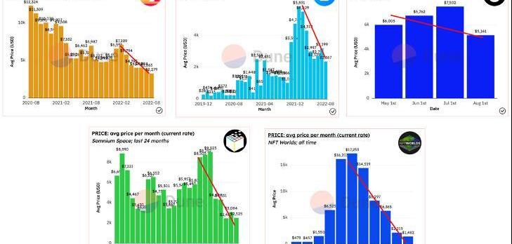 从地皮的平均成交价格来看,Dencentraland和TheSandbox的的地皮仅回调了50%,Otherside的成交价格表现依旧稳定,而NFTWorlds和SomniumSpace这些小的资产表现则超跌于蓝筹地皮。