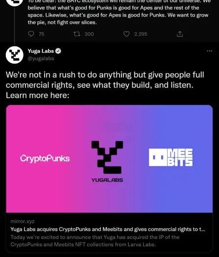 除此之外,YugaLabs在尊重项目文化,倾听社区声音方面的谦虚姿态,使人对他们开发旗下各路诸侯潜能的能力有着足够的信心。在收购CryptoPunks和Meebits之后,YugaLabs没有选择快速动作,而是选择慢下来,在社区自发的动作中加深对项目文化的理解。一个元宇宙生态内的各个项目不应该是割裂的,他们独有魅力中的一个个闪光点应该彼此被看到,彼此被吸引。深入的了解和牵引,才能形成项目间的有效串联,使生态内部的联系更加紧密。