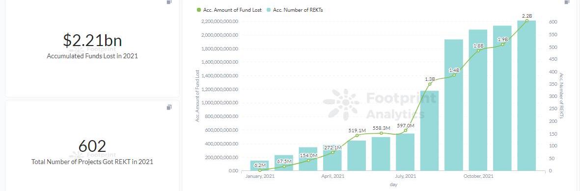 根据FootprintAnalytics的数据,2021年有600多个项目被REKT,其中三分之一遭遇资金损失,累计金额达22亿美元。