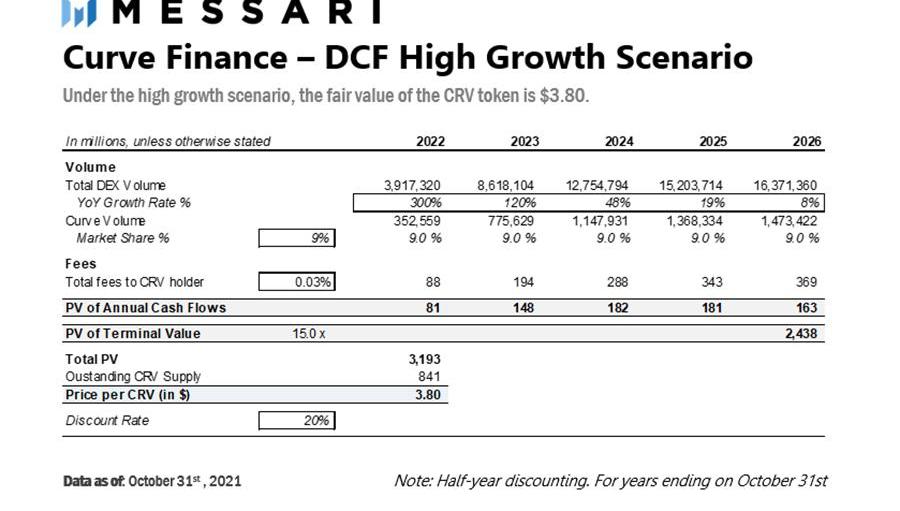 现金流贴现分析基于协议的5年预计增长。在这种情况下,该模型对可归因于代币持有者的交易量产生的部分现金流进行估值,这相当于总交易费用的50%。