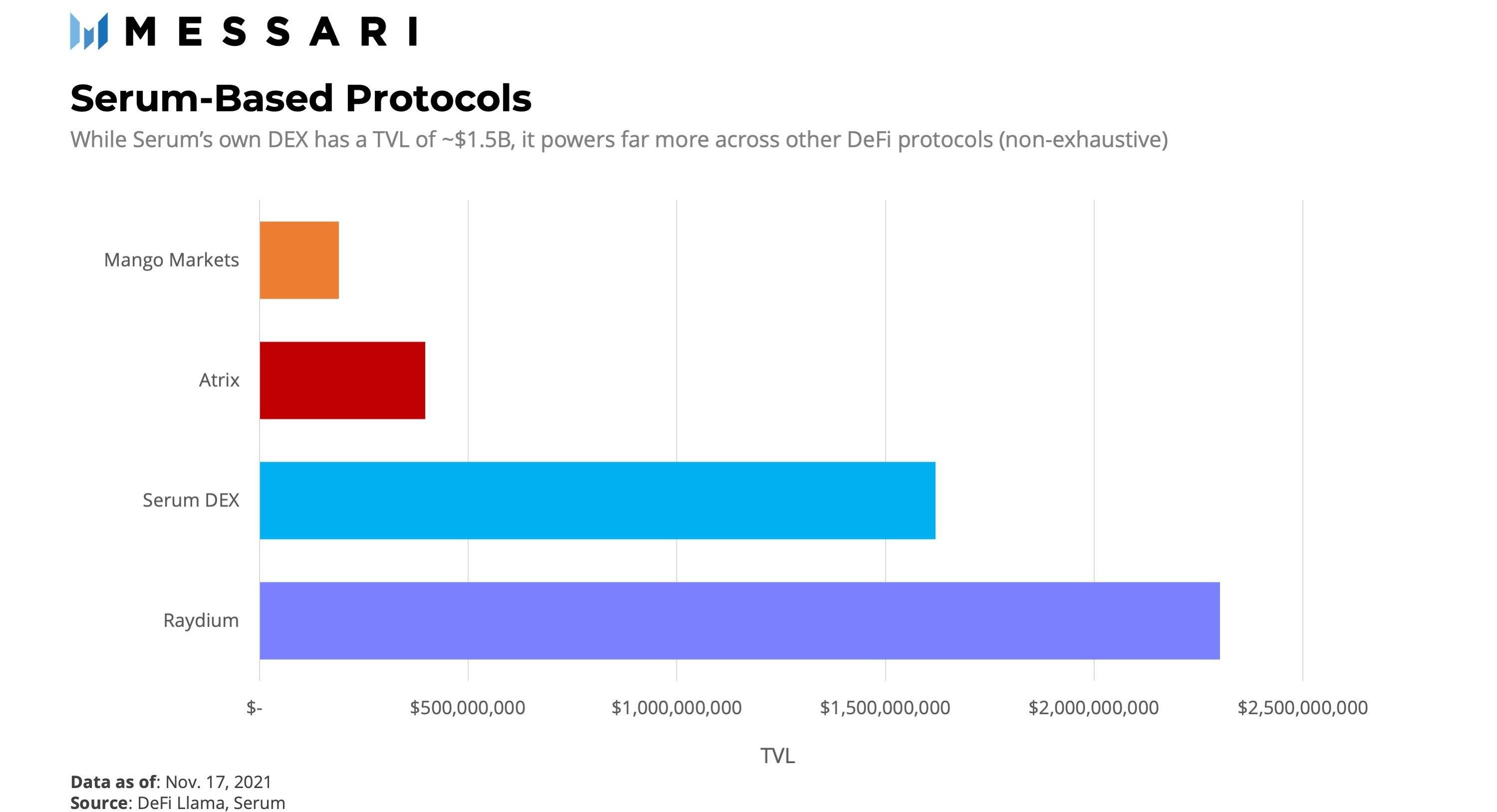 事实上,Solana的许多顶级DeFi协议都是由后端的Serum订单簿提供支持的。例如,Raydium、Atrix和MangoMarkets都建立在Serum的开源DEX基础架构之上。虽然他们设计了独特的图形用户界面(GUI),并且在许多情况下实现了新的DeFi功能,但Serum是其协议架构不可或缺的一部分。随着Solana上的DeFi不断成熟,许多人预计Serum的集成将继续扩展。