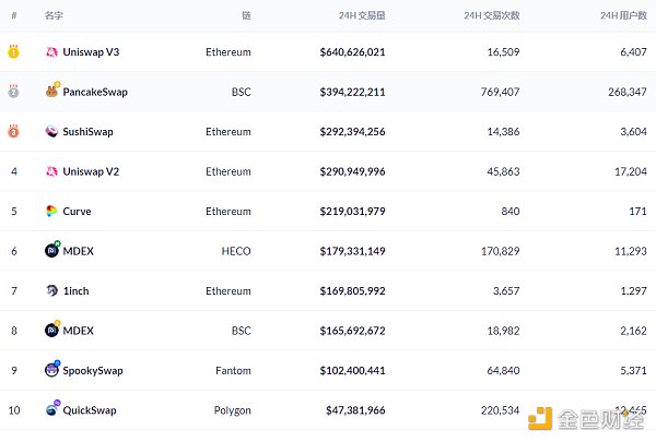 过去24小时去中心化交易所的交易量数据来源:Debank