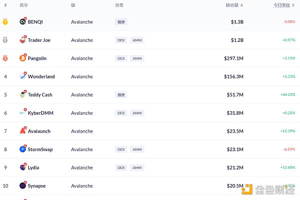 Avalanche链上DeFi锁定资产前十排名及锁仓量,数据来源:Debank