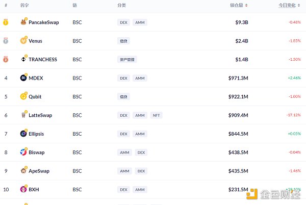 BSC链上DeFi锁定资产前十排名及锁仓量,数据来源:Debank
