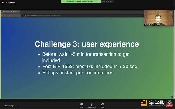 最后,Vitalik 提到了一个Ethereum经常遇到的问题。Ethereum的用户有时会遇到体验下降,因为交易确认时间通常需要 1-5 分钟。他建议,引入 EIP 1559 后,大部分交易都在 20 秒以内,未来还会不断减少。