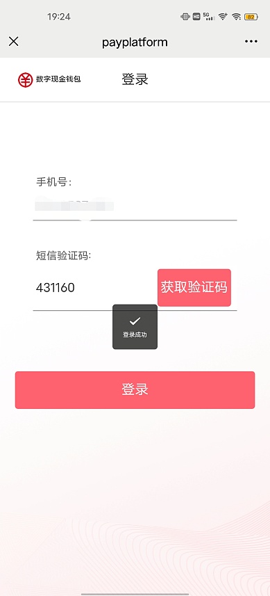 5G消息自动识别用户手机号,输入短信验证码就可以快速登录数字人民币钱包。