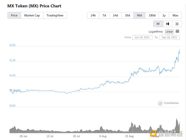 据Coingecko数据显示,2021年9月18日抹茶交易所(MEXC)平台币MX价格较昨日大涨28%,最高触及1.93 USDT。这是MX自15日来第二次录得超过20%的日内涨幅。
