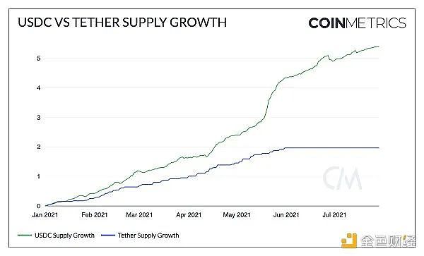 USDC的供应量从2021年年初的约40亿美元增长到超过260亿美元。5 月加密货币大跌后,USDC的增长开始加速——自5月11日以来,USDC的总供应量增加了约75%。Tether (USDT) 仍然是稳定币市场的主导者,总供应量超过640亿美元,但自5月以来USDT增长趋于平缓。USDC是仅次于Tether的第二大稳定币,其在稳定币总供应量中的份额正在增长。
