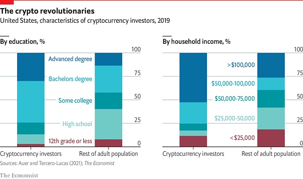 政策制定者的担忧是正确的,尤其是对加密货币领域存在的欺诈和的担忧。但如果给所有加密货币投资者贴上幼稚或不成熟的标签,那将是一种误导。国际清算银行的 Raphael Auer 和巴塞罗那自治大学的 David Tercero-Lucas 最近的研究表明,美国的数字货币持有者往往受过良好教育,收入较高。使用从美联储 (Fed) 2019 年的调查数据,他们发现,除了更年轻且以男性也为主外,与不投资加密货币的人相比,加密货币投资者获得大学学位的可能性大约高出75%,其年收入超过 10 万美元的可能性也高出 2 倍。奥地利央行的 Helmut Stix 最近进行的另一项研究也发现,平均而言,加密货币投资者比回避数字货币的投资者更懂金融。